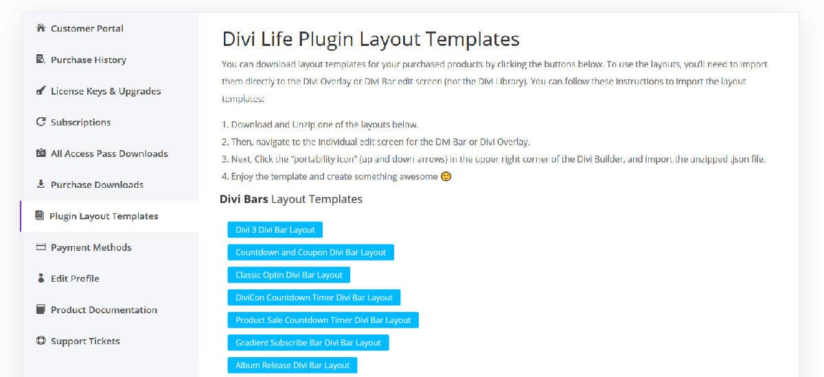 - Download Divi Bars from the Purchase History page (or the All Access Pass Downloads page for members)