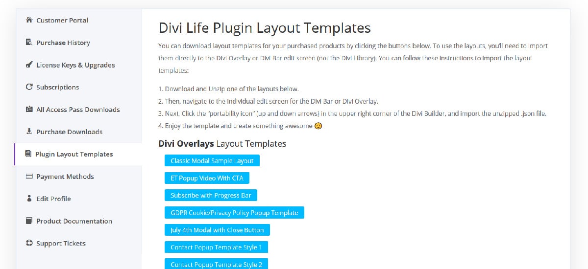 - Download Divi Overlays from the Purchase History page (or the All Access Pass Downloads page for members)