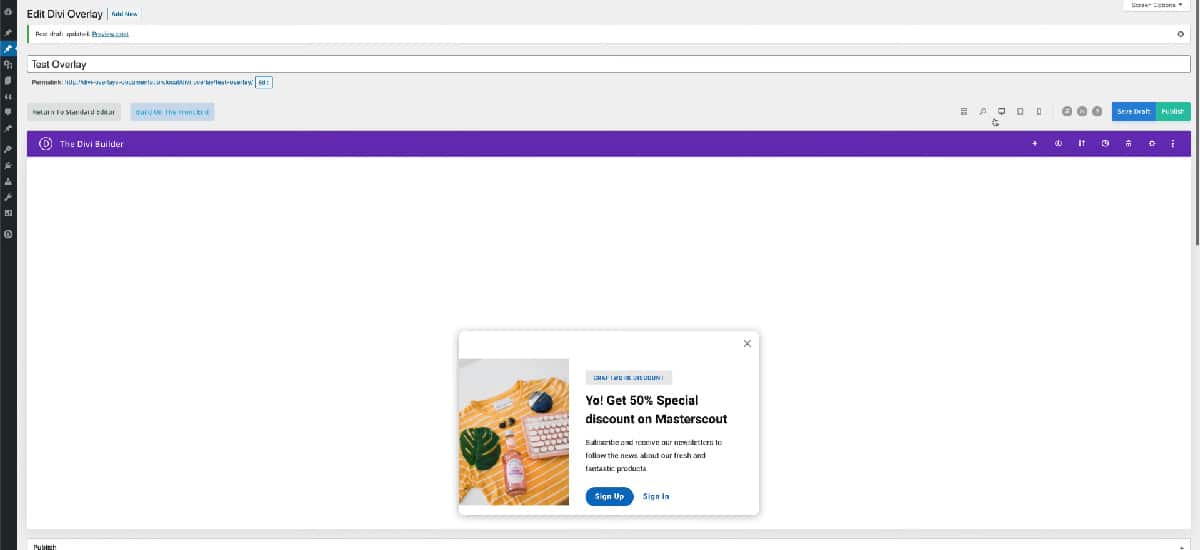 Once you save changes and exit from the Divi Builder, you’ll be able to open the overlay. Divi Overlays gives you full control of the content you want to show and easy to customize.