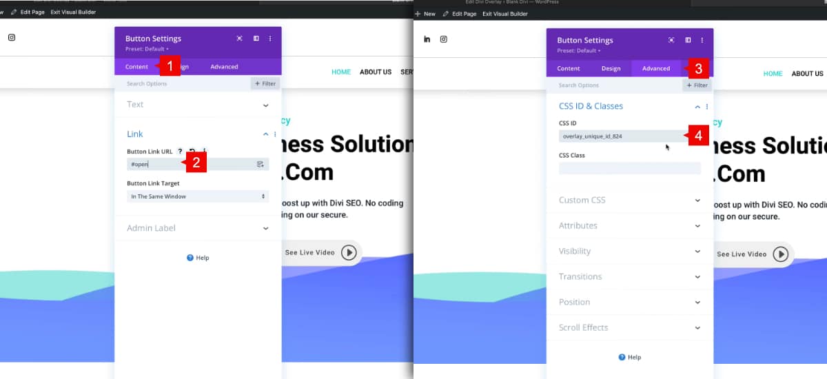 NOTE: Divi requires that the URL field is not left blank, so we use what’s called an “anchor link” to satisfy this. It can be any text you want following the # symbol (ie. #open, #overlay, #popup, etc)