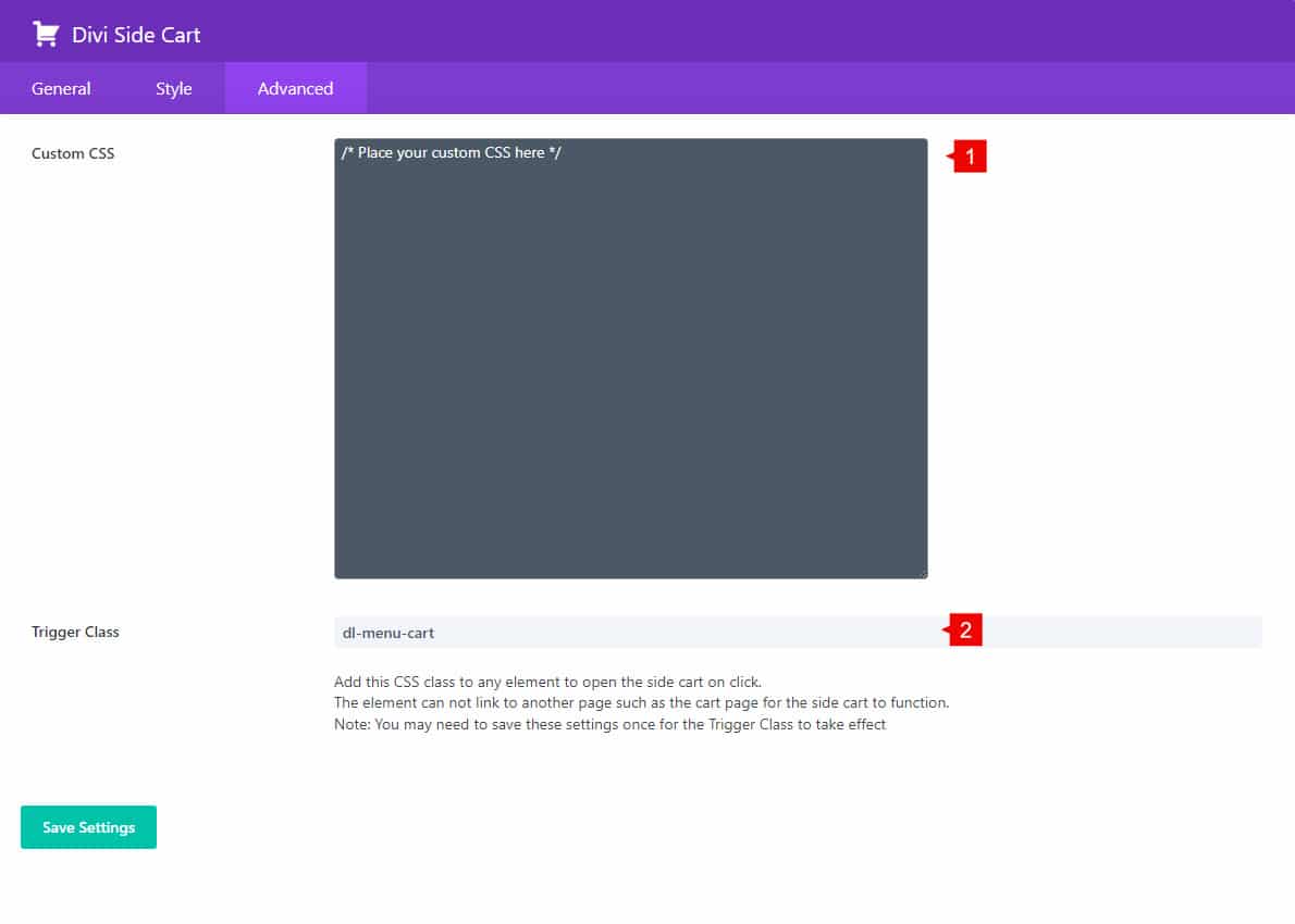 2. Custom triggers: Create a custom class that can be added into any Divi module or menu item to trigger the side cart.