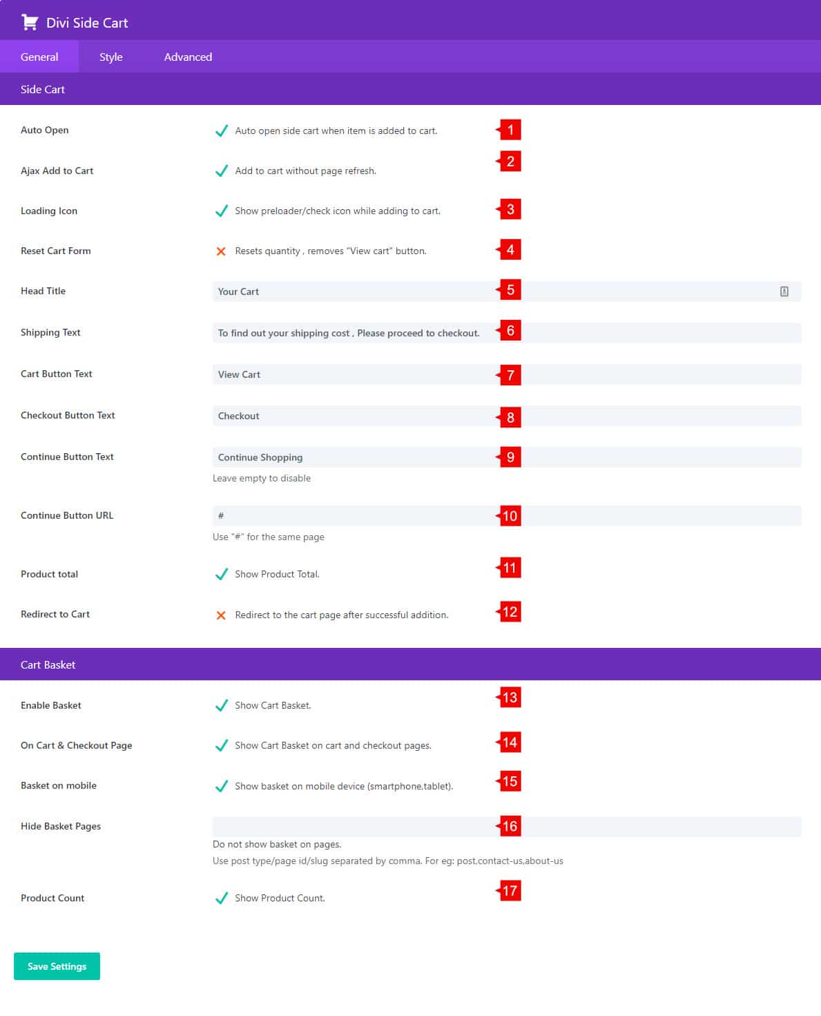 13. Enable Basket: Show/Hide the Cart Basket on your site.