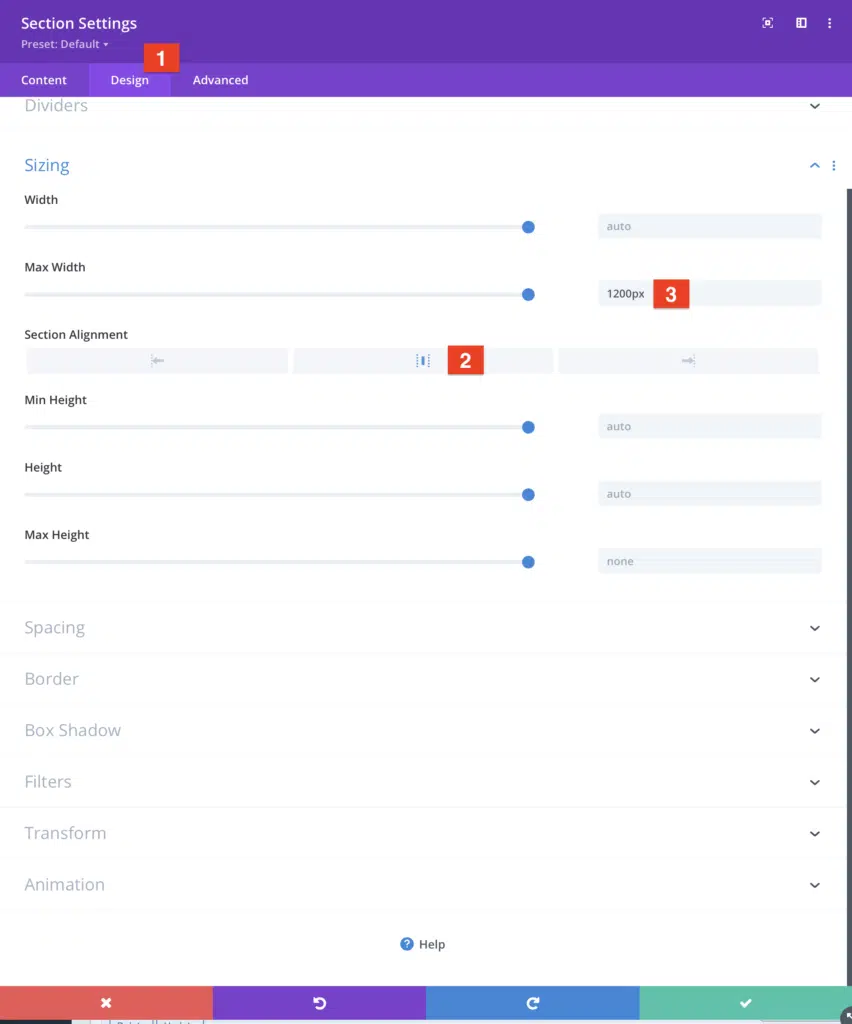 Step Two: Open the Section Design Settings in your Mega Pro Layout and change the section Max-Width to the desired width, and change the section alignment to centered.