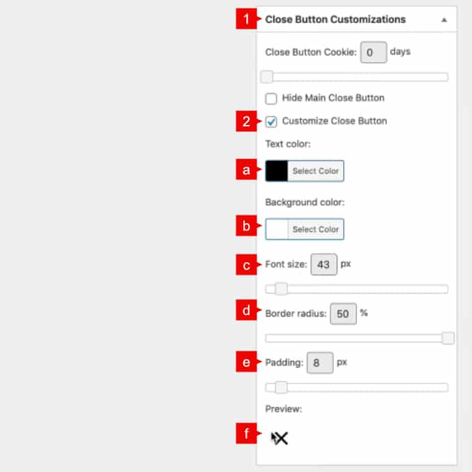 c. Font Size. Control the size of the X button.