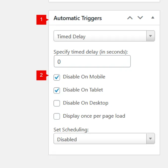Note: This feature is only relevant for Automatic Triggers. If you want to disable a click triggered popup on specific devices, then hide the click trigger on the specific device using Divi’s built in Visibility Settings (advanced tab of section/row/module).