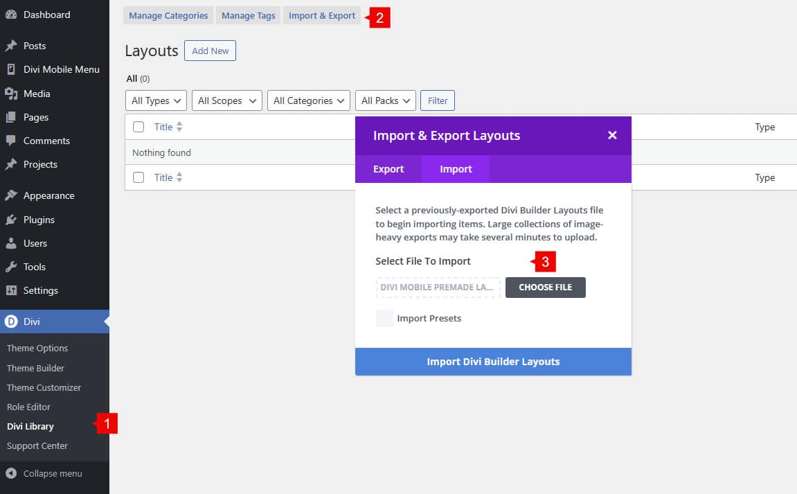 - Divi Library Layouts: With this option, you can import the layout directly to your Divi Mobile Menu post from the Divi Library.