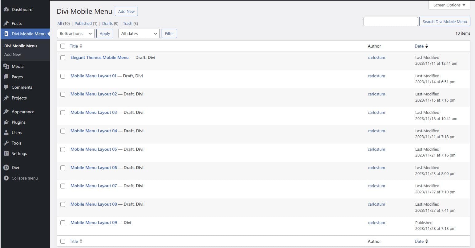 When you click the “Submit”, it will import the layouts to Divi Mobile Menu CPT.