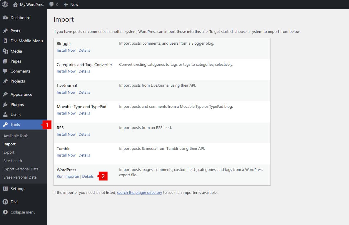 - To import the XML file, go to your WordPress Dashboard > Tools > Import