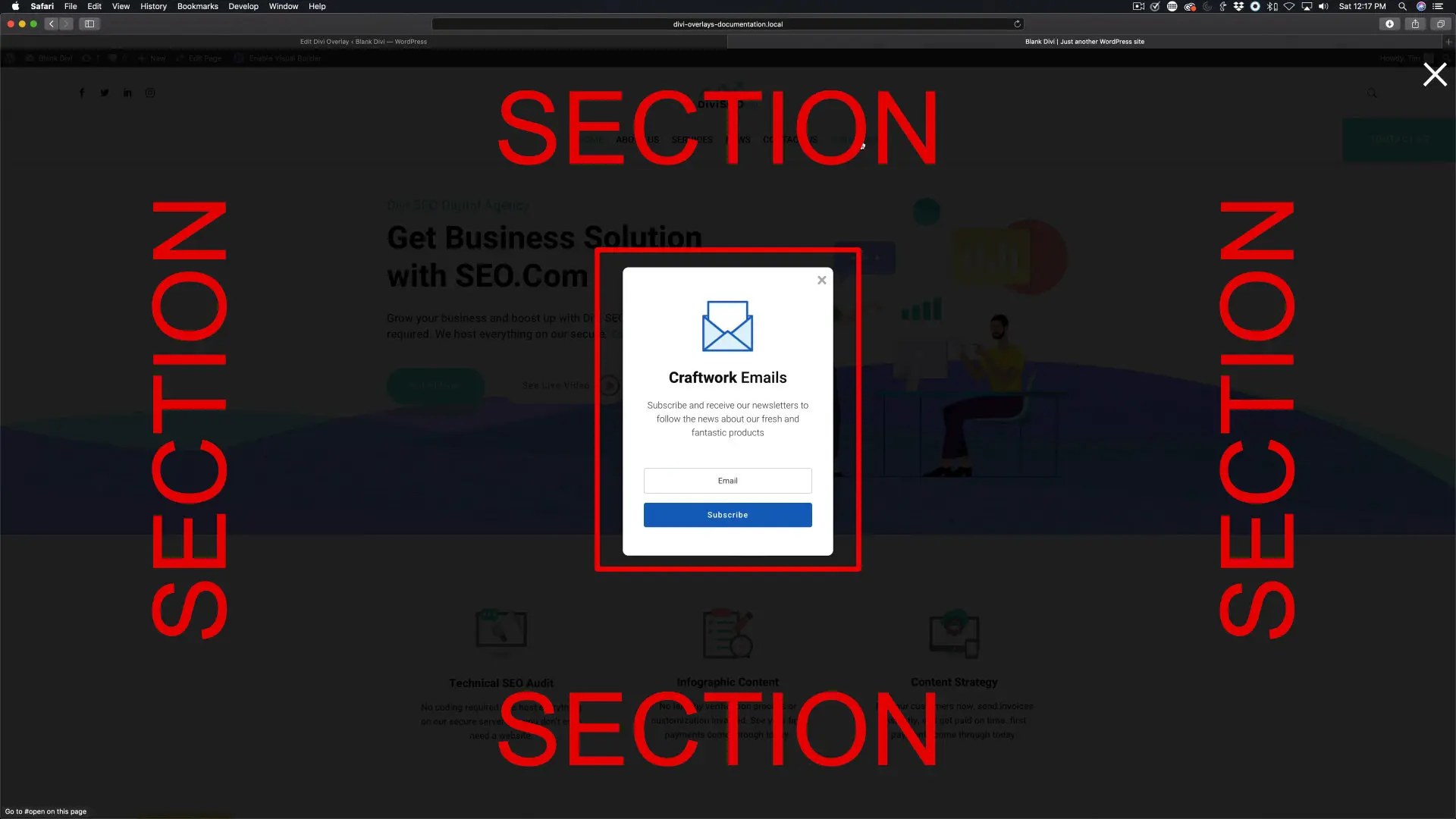As mentioned in the introduction, clicking outside of the overlay “content” will automatically close the overlay by default. However, the “content” also includes the Divi Section which is often transparent and extends the width of the overlay itself. Clicking the Divi section won’t close the Overlay by default. Â So it’s common to not realize that the empty space around your popup is actually still considered “content” by Divi Overlays since it’s the section that houses the Divi row and modules of your overlay popup. So to make your Divi section also close the overlay when clicked, simply add the CSS class close-divi-overlay to the sections CSS class field within the Advanced tab.