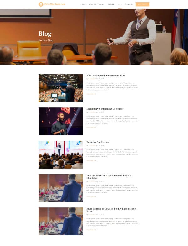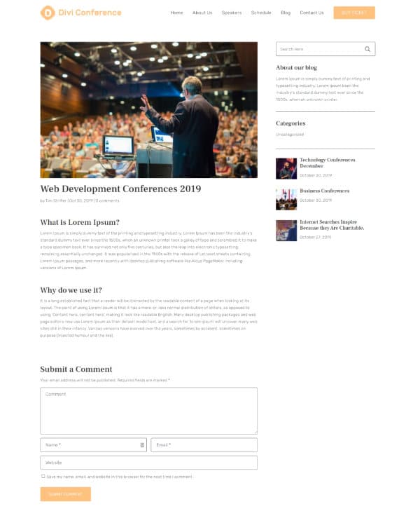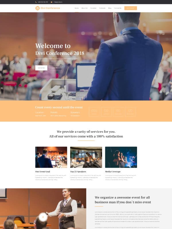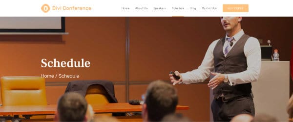 Divi Conference includes 7 unique pages (Home, About, Blog, Blog-Single-Post, Speakers, Schedule, Contact) and features a modern design that is perfect to promote your next conference or event (digital or in person!).