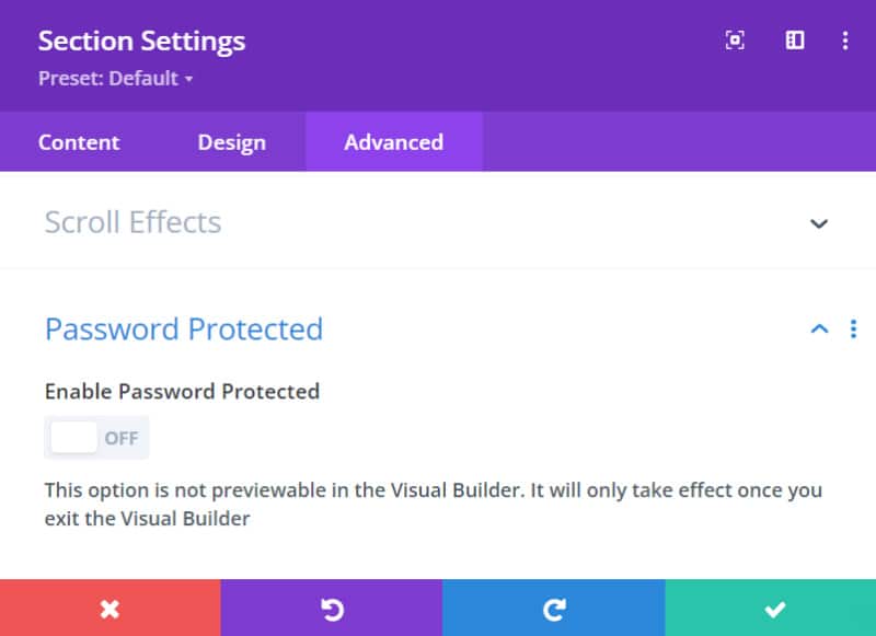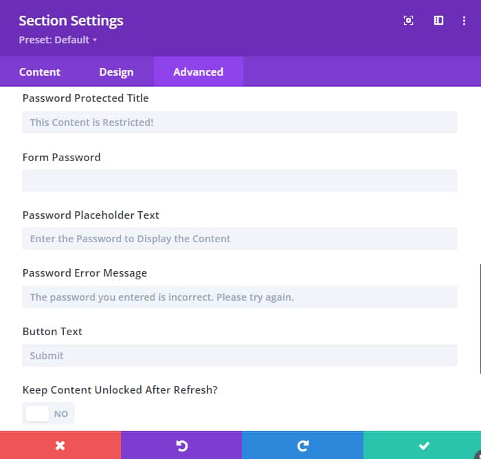 As easy as switching on a button! Just enable the Divi Password Protected on your section, row or module and set a password. No custom coding required!
