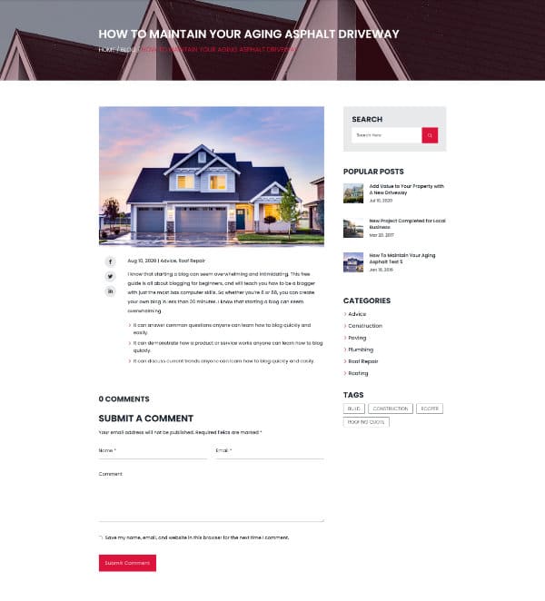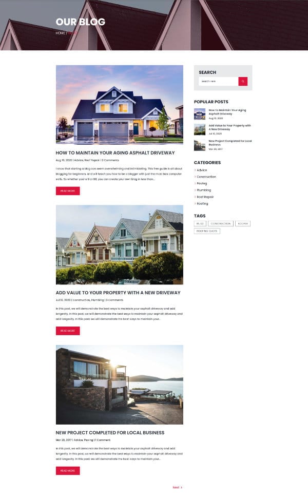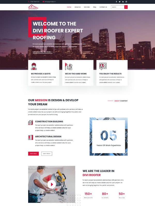 Divi Roofing includes 7 unique pages (Home, About, Blog, Blog-Single-Post, Services, Contact) and features a modern and colorful design.