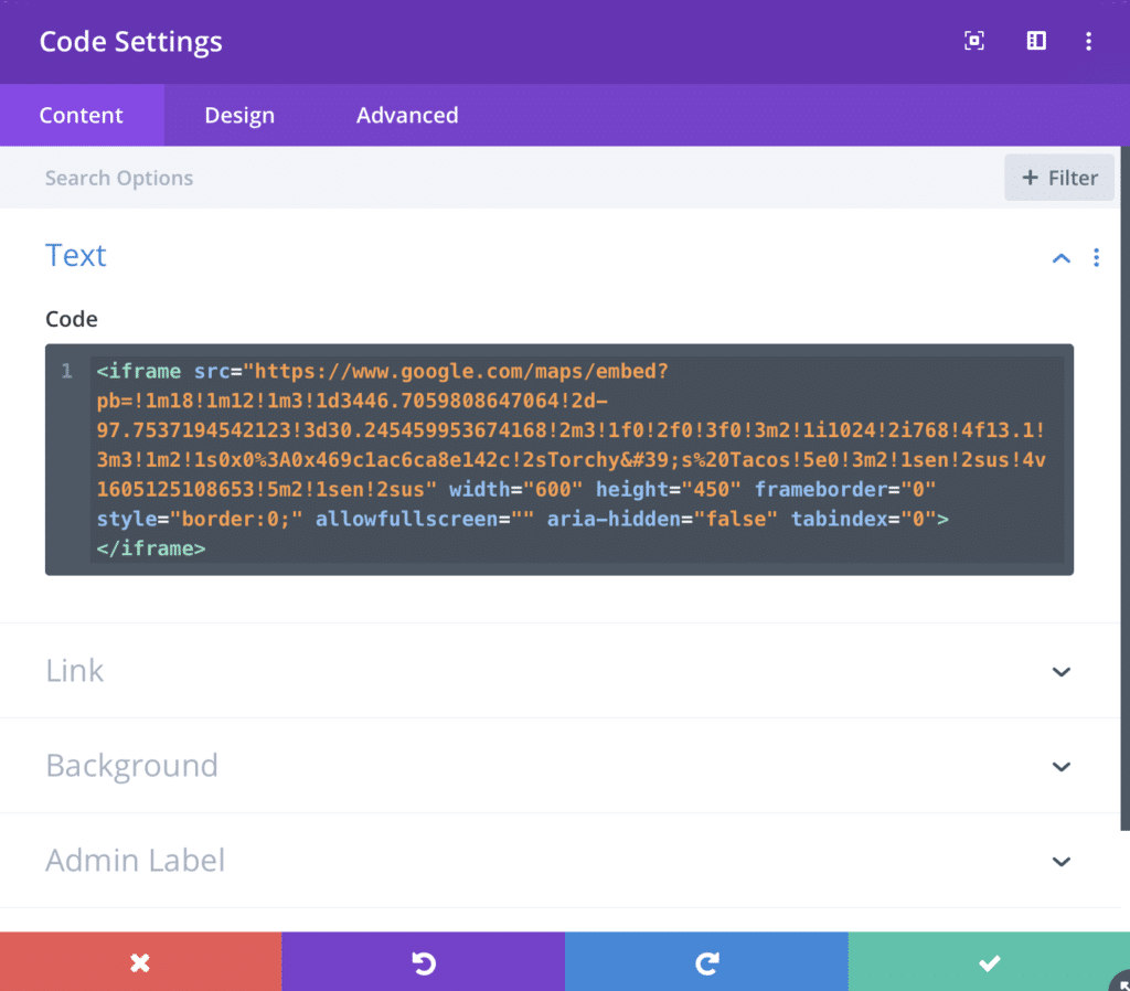 Using the Divi code module, we can embed a Google Map. This allows us to circumvent the need to set up the Google API (which is a huge hassle).