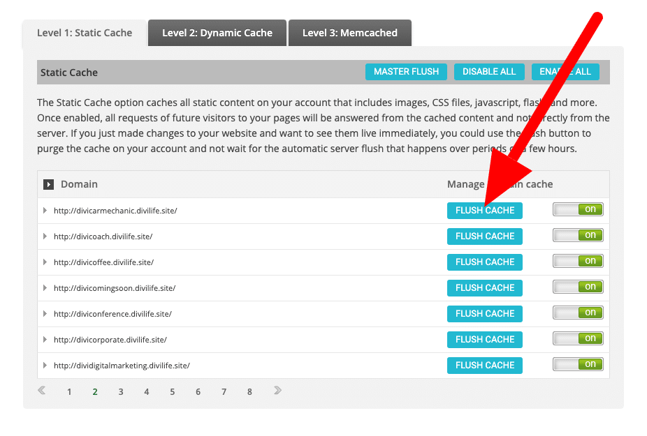 3. Click ‘Flush Cache’ next to the site you’d like the cache cleared for.