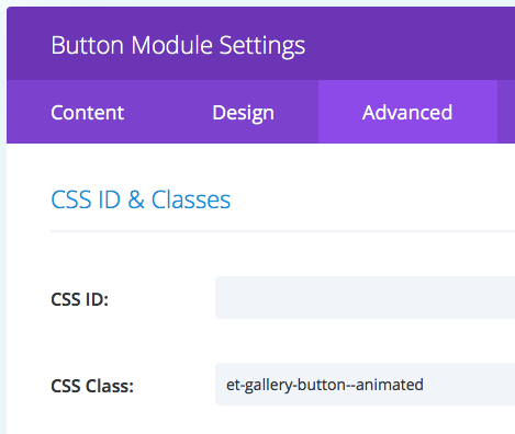 The lat thing we need to do in the button module is add the following to the CSS Class filed in the Advanced tab:Â et-gallery-button–animated