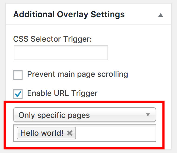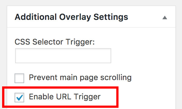 Navigate to the overlay edit screen (for the overlay you’d like to set up a URL Trigger for), and find the box for “Additional Overlay Settings.” Then, check the box for “Enable URL Trigger.”