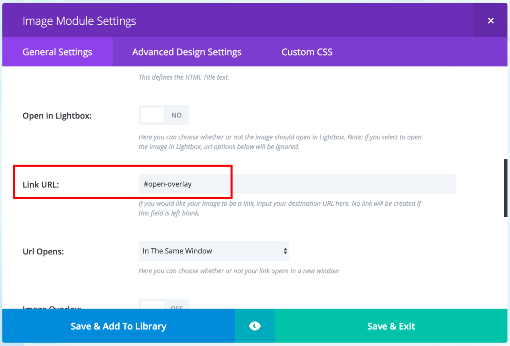 Next, you’ll need to add the text #open-overlay to the “Link URL” field in the “General Settings” tab.
